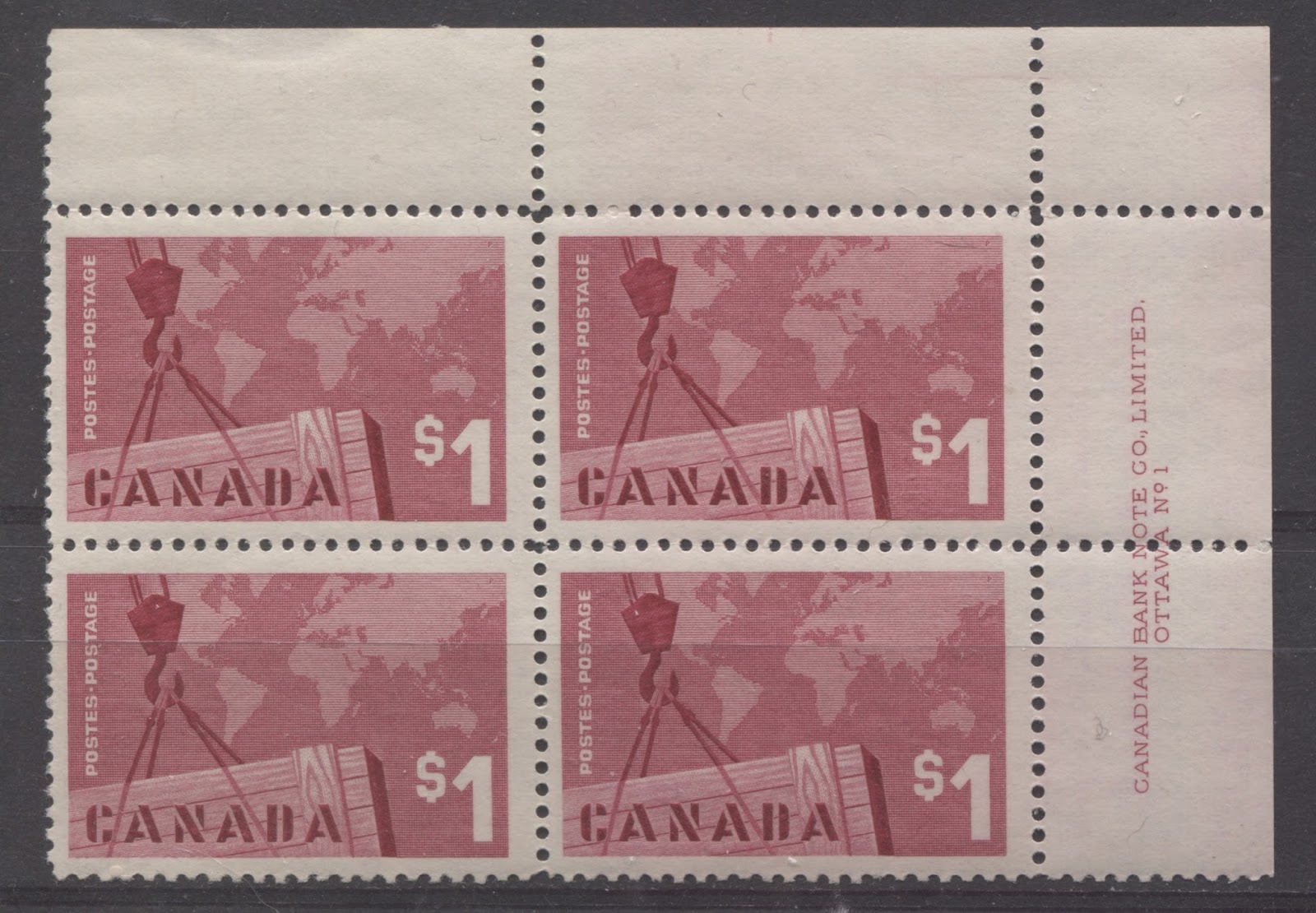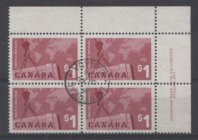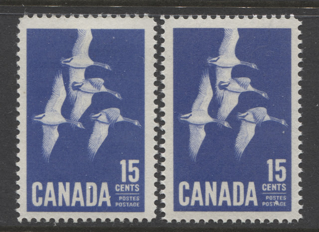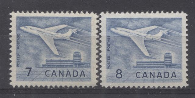 Most of the values of this issue can be found with at least two shades, with the 3c purple being an outstanding hunting ground for many, many shades of purple that can be found due to difficulties that the CBN experienced with the stability of the colour. The only stamps that seem to show almost no variation are the 2c green and the jet plane stamps. However, I'll bet that with enough searching, it is possible to find some subtle shades of even these stamps. I will try to show some examples of the main shades I have seen in the stamps that I have worked with so far over the years. Of course, there are likely others (many others in the case of the 3c) that are not shown here. But this will hopefully give you some idea of the scope that exists.