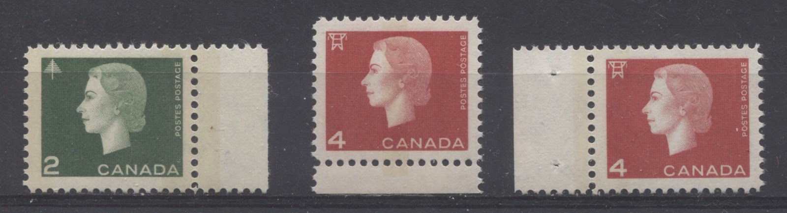 In the scan above, the 2c green stamp has the normal 2-bar tagging, the centre stamp has a 4 mm centre band tag, while the one on the right has the 8 mm side bar at the left.