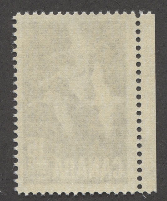 The first type of paper on which this stamp is found is shown above. This is a vertical wove paper that has a creamy appearance in normal light, and which shows clear vertical mesh on the gum side as shown above. The printed surafce is smooth, with very few pores being visible under a 10x loupe. The gum is a deep cream, smooth and hs a semi-gloss sheen. Under ultrviolet light, the paper gives a dull fluorescent greyish white reaction, with no fluorescent fibres visible.