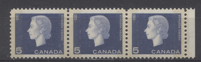Now, I have only checked few dozen of each value, and based on the pattern above, it does seen highly likely that all values can be found with all four perforation combinations. This immediately raises the question of which ones are scarce if any? Who knows? This would be a fantastic research project to a specialist to tackle, as you could study the perfs on the regular stamps, the tagged stamps, the booklet stamps, the miniature pane stamps and finally, the official stamps. The coils are listed in Unitrade as being perforated 9.5 horizontally. My Instanta gauge does not go below 9.8, so unfortunately I cannot verify the exact measurement.