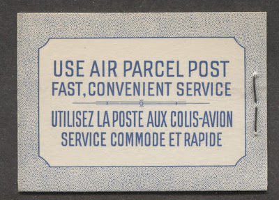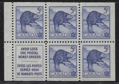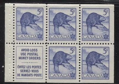 The 5c beaver stamp was also issued in booklets containing one pane of five stamps plus label. The booklets all had the standard bilingual cover shown above. However, both the front cover and the back cover can be found in two different dies, which I will illustrate here. In addition, some of the booklets were bound with a 17 mm staple, as shown above, while others were stitched with thread. Both types of booklet can be found with two types of front cover, and two different types of back cover, for a total of 8 basic different booklets. However, it is possible to find booklets where the covers contain some plate or die flaws that are not listed in any catalogue or handbook. For instance, if you look carefully at the front cover above, you will see a large blue dot next to the word "Cinq" in the text panel to the immediate right of the coat of arms. That is a plate flaw, as there is ordinarily no dot there. Finally, it is also possible to find booklets where one or both of the front or back covers show traces of the cutting guidelines, ones where the panes themselves show traces of these guidelines.