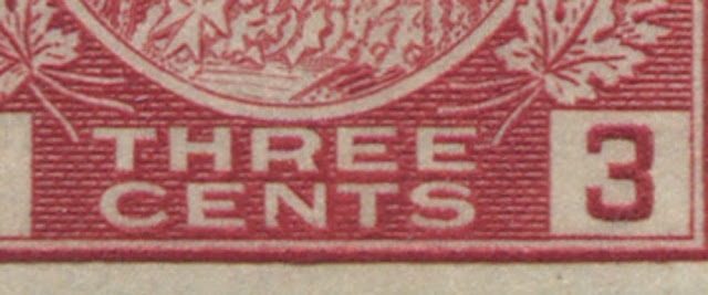 It can be a little harder to see on some stamps than on others, but the re-drawn frameline is clearly a much thicker line than the re-touched frameline. In reality both types are found on all values of the series, but Unitrade only lists them on a few values. The re-touched frameline is only listed on the wet printings of the 5c violet, some of the 5c blue, the 7c yellow-ochre and the 10c plum. Of these, only the 5c violet and 7c were listed until just a few years ago. The re-drawn frameline is only listed on the 5c violet, 20c olive green and 50c black brown. In actual fact, some stamps like the 8c blue and 10c bistre brown are only found with the re-drawn frameline, as they were issued after the new plates were made.
