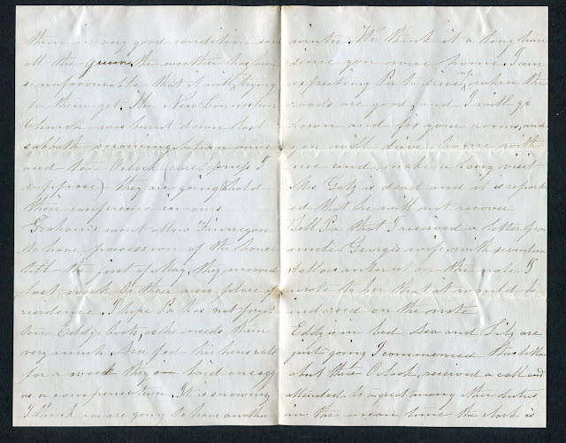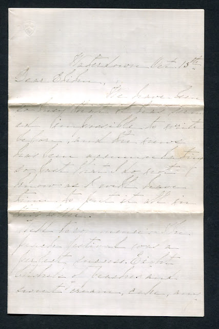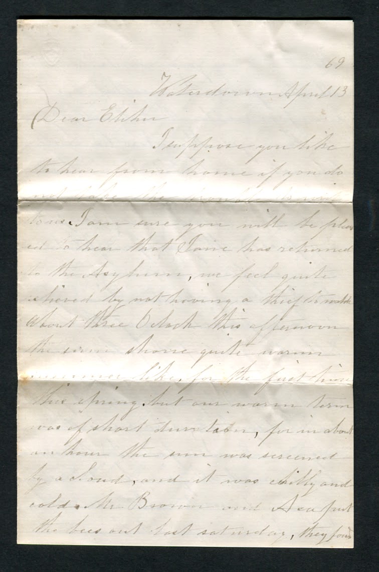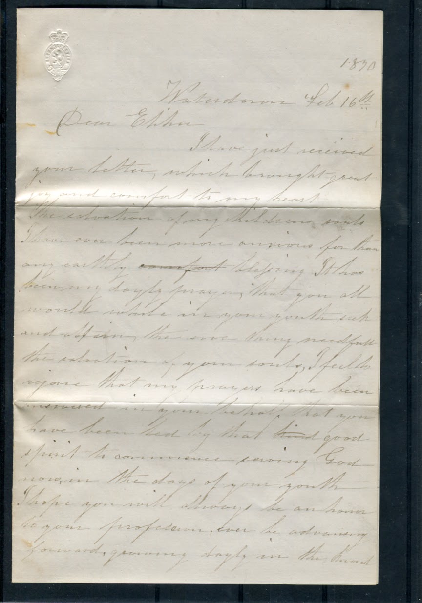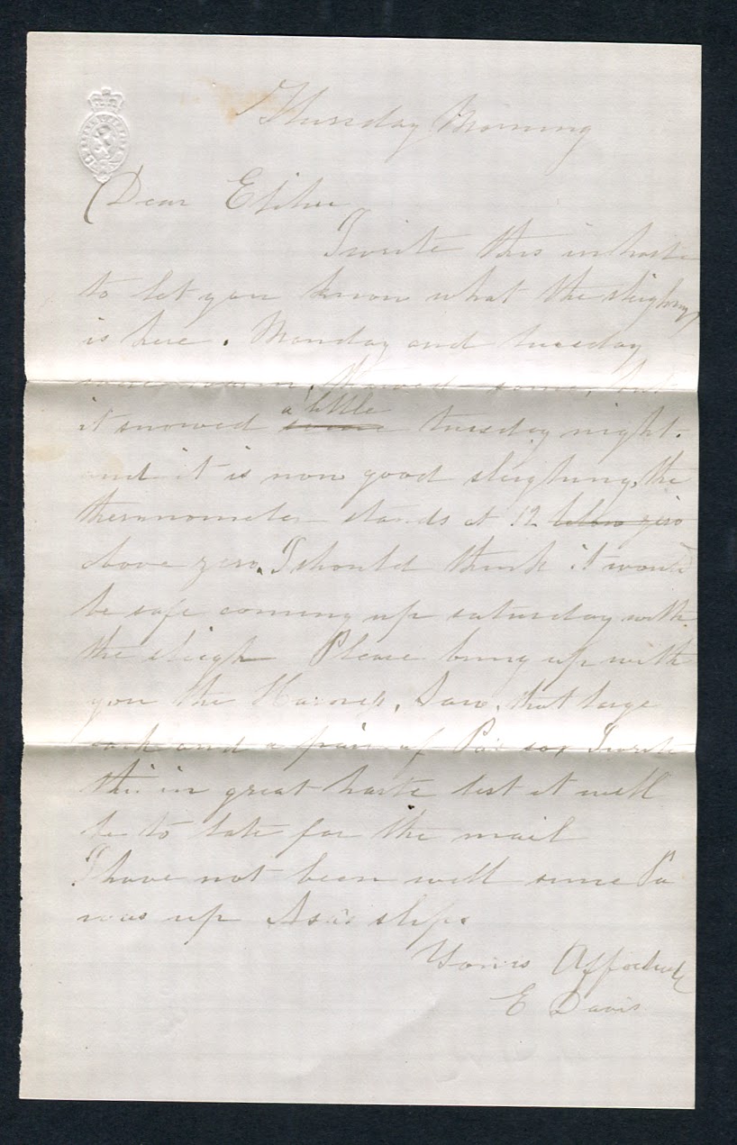So it quickly became apparent that Elizabeth Pease, who I found out was born in 1822 was writing to her then 18 year old son Elihu. She would have been 47-48 years of age when these letters were written. She was clearly writing the letters to report the family events, but also to admonish him in the third letter for not visiting or writing more often and then urging him in the last letter to find God and the church. In many ways not much has changed: a middle aged parent is trying to guide their newly minted adult child.