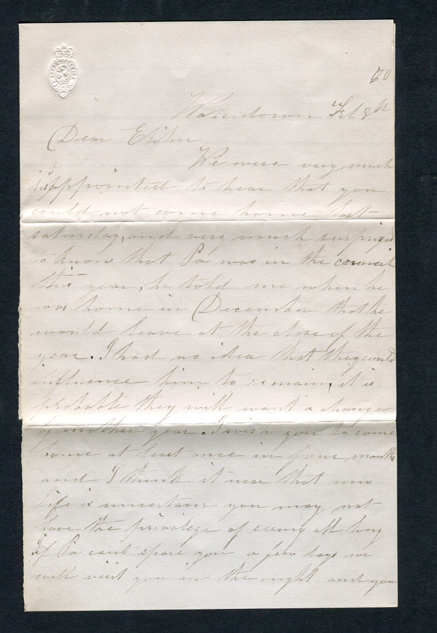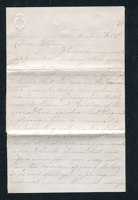 The next three letters were all sent in quick succession on February 3, 1870, February 8, 1870 and February 16, 1870:The third letter was a single page. Note the lovely embossed figure in the top corner for Extra Superfine paper.