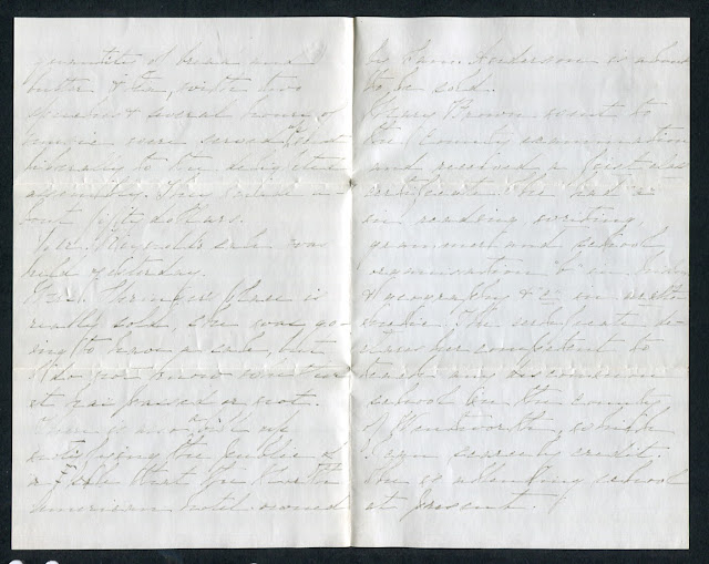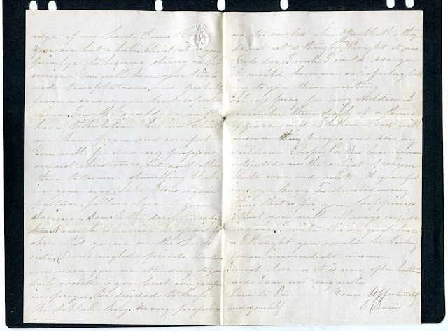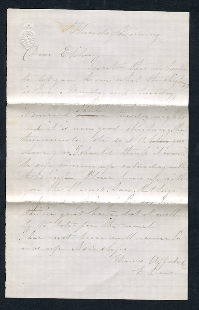 I started to read the letters in order, although many of the words are difficult to make out. What struck me about them was how little the writer had to say about themselves and their own thoughts. Most of the content was a reporting of everything that was going on with the lives of various members of the family, plus a very personal appeal in the last letter to "pursue God's work". The writer wrote about the weather being 16 degrees in the middle of an Ontario winter! I later wondered if this reference was in Fahrenheit rather than Celsius, but I suppose it is possible that winter back them was warmer in mid February. In any event, I found it really quite fascinating to read about the happenings in the life of the Davis family between the Autumn of 1869 and the Winter of 1870.