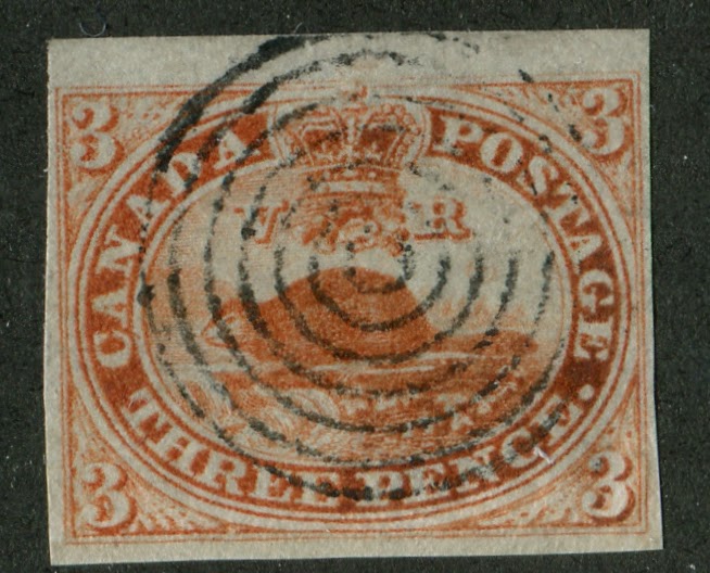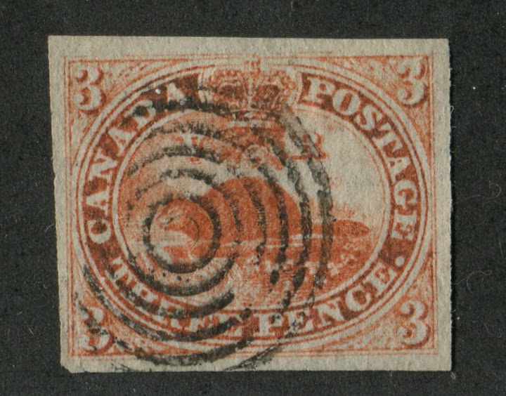 The 3d beaver was Canada's very first stamp issued on April 23, 1851. The initial print run, of which this is an example, was 250,000 stamps. The number surviving today in condition like that shown is very minute. There are fewer than 10 unused copies thought to exist. At a minimum, a mint example without any of the original gum will be at least $10,000. A very fine used example catalogues $1,600 and will usually sell for close to that amount. This initial printing is on a very thin, laid paper, which shows feint horizontal lines accross the stamp. Sometimes they are so feint that they require immersion in watermark fluid to see them.