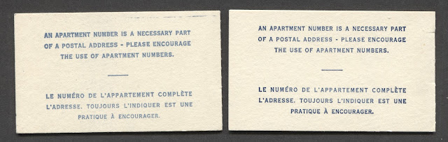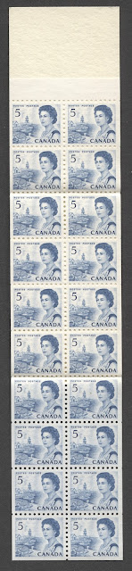 Today, I start to examine the integral booklets that were produced for this issue. They are called "integral" because the booklet covers were a single piece of card stock, which was folded, and the booklet panes were glued onto the cover using the tab of the pane, rather than being either stapled or stitched. They were also significant as they were the very first time that se-tenant combinations of different designs and denominations were to appear in the same booklet pane. The printing technology required to accomplish this was in the hands of the British American Bank Note Company (BABNC) rather than the CBN. So the introduction of these booklets marks a unique period in Canadian stamp production in which two different printing firms collaborated to produce a Canadian stamp issue. Prior to this, every issue of Canadian stamps was printed by one firm or another, but never two firms at the same time. These booklets are also interesting in the sense that they are the first booklets to feature panes that are comb perforated, rather than line perforated, and also the first to include panes printed with PVA, rather than dextrine gum.