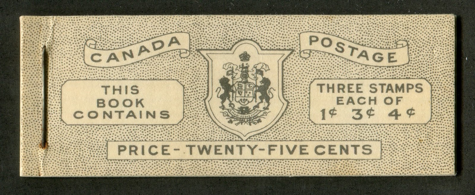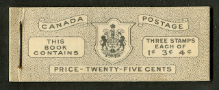 The 1c, 3c and 4c were issued in booklet panes of 3 each, contained in what is commonly called a "chewing gum booklet". The stamps from these booklets are easily distinguishable from the next two because the top and bottom edges are imperforate, as is the right edge on the end stamps. These were issued in both English and bilingual formats. There were 305,550 English booklets (916,650 stamps of each value), and 154,050 bilingual booklets (462,150 stamps of each value). The 3c was also issued in 25c booklets, each containing 2 panes of 4 stamps plus 2 blank labels. Finally the 4c was issued in 25c booklets each containing 1 pane of 6. The 25c booklets containing the two panes of the 3c were issued in both Bilingual and English formats. There were 200,000 English booklets issued (1,600,000 stamps) and 50,000 bilingual booklets (400,000 stamps). The 25c booklets containing the panes of 6 4c stamps were also issued in both formats, with 2,502,000 English (15,012,000 stamps) and 700,275 bilingual booklets (4,201,650 stamps). Thus the number of booklet stamps issued of each value is: