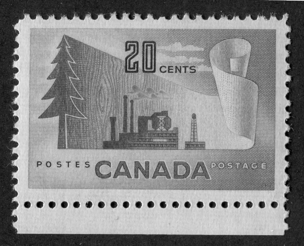 The 20c Pulp and Paper Industry stamp was designed by Allan L. Pollock and the engraving was done by Joseph Keller.