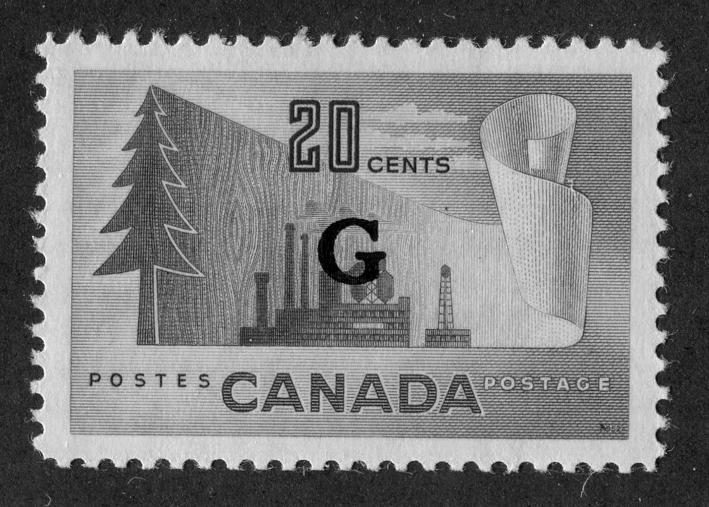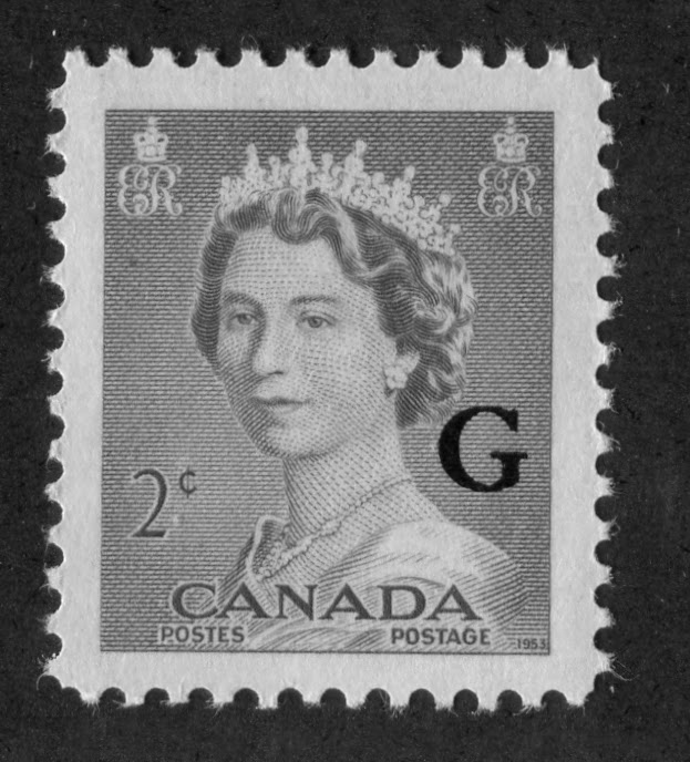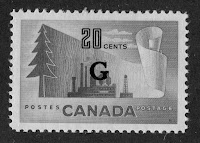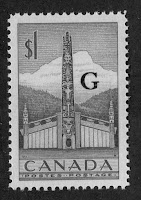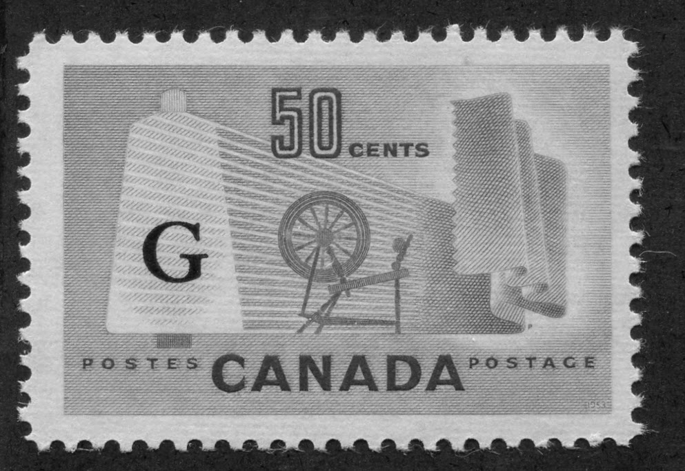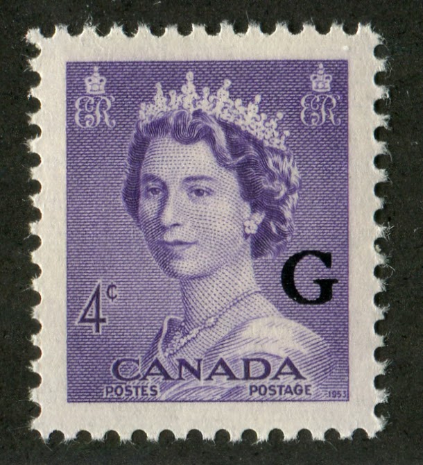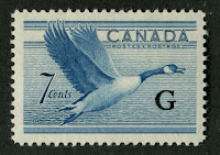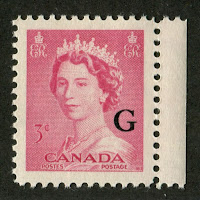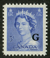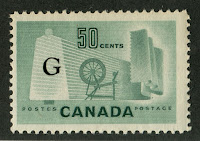 It is possible to find narrow spacing and wide spacing varieties of the G overprints, although I have not seen any listed for this issue. It would be worthwhile, I think to conduct a detailed study of sheets and large blocks to see of any such varieties can be identified. Misplaced G's are also possible, though once again, Unitrade does not list any. The 50c exists with a blunt G overprint of the Casson font and a fishhook G.