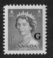 All the stamps of this issue exist with a "G" overprint for use by various government departments. The standard typeface used is shown on the 3c stamp at left. It is known as the 14 point Caslon font. It is possible to find small varieties in the thickness of the G that likely came about as the typeface wore (the early G's are thinner). On April 24, 1961, the typeface was changed to 14 point bold font as shown on the right. This is know to collectors as the "Flying G". It can also be found without any upper serif and with no protruding crossbar. This type, is known as the fishhook G and is shown below: