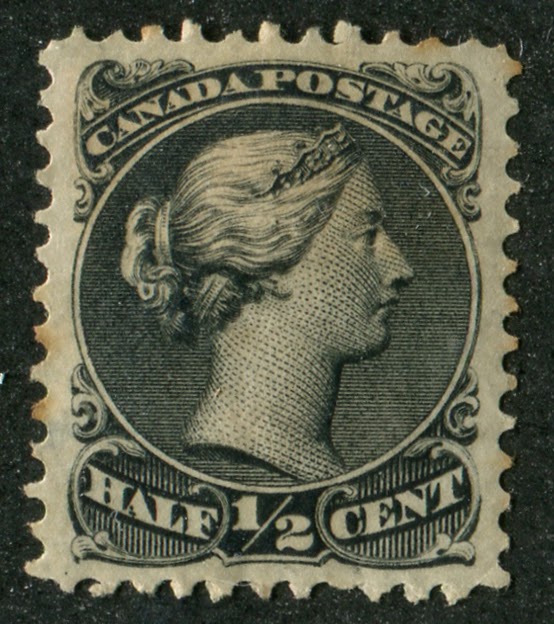 1. On the half cent, a small spur protruding left from the outermost ornament just to the upper left of the "H: of half can be seen on some stamps. A variation of this in which the spur is in the form of a small "H" also exists as well. There can also be found stamps showing a line above the "P" of postage, and finally the Chignon variety, which is an absence of shading in the bun of the Queen's hair.