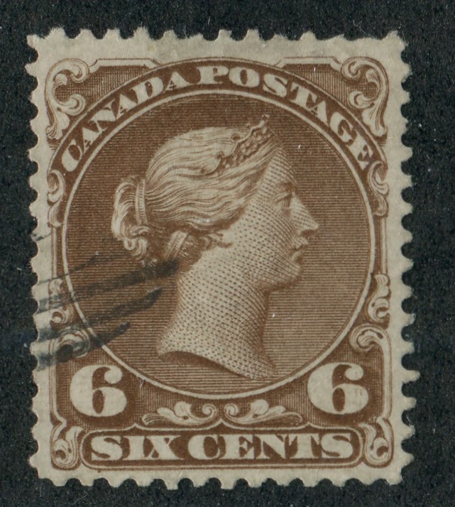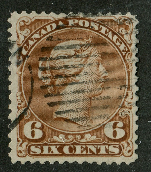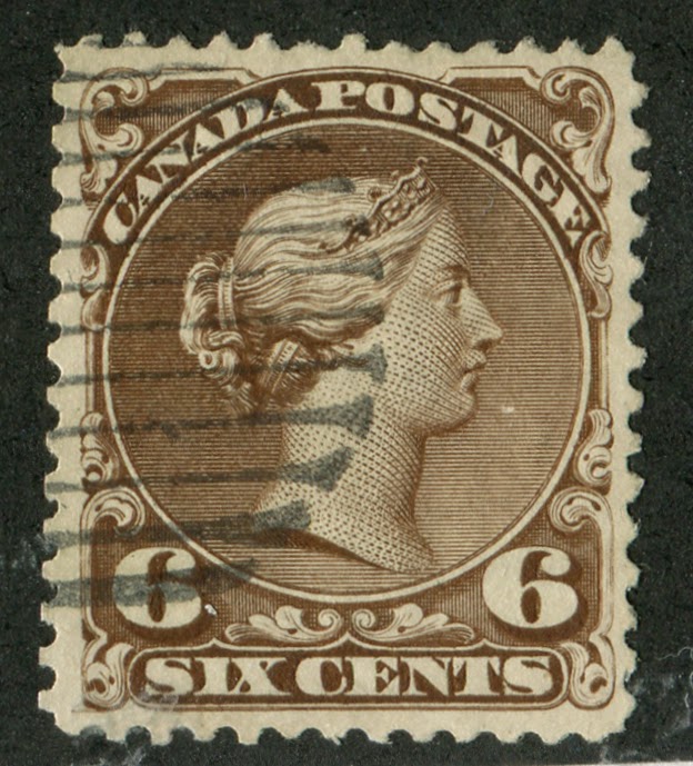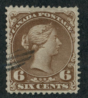 The 6c brown paid the rate to the USA and the Red River Colony (what is now Manitoba), or it could be used with a pair of 2c stamps to pay the 10c rate to British Columbia and Vancouver Island. It is the third most common of the stamps in the set, with 9.4 million being issued before being replaced by the 6c Small Queen in January 1872.