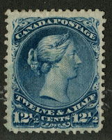The 12.5c blue paid the rate to Newfoundland and the UK via Newfoundland. It is the second scarcest value in the series, with only 1.94 million printed. It is curious then, that it has the same catalgue value as many of the more common stamps in the series like the 1c, 2c and 6c. It should be catalogued much higher than these stamps, but for some reason it isn't.