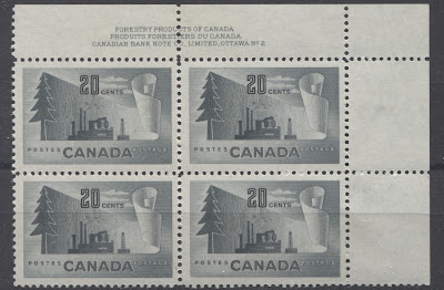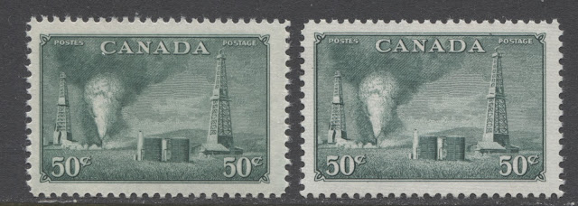 The 50c Oil Wells design was engraved by the well established engraver, Silas Robert Allen, who had been responsible for the beautiful 12c-20c designs of the 1928-1929 Scroll Issue, and many others in the intervening years. The 20c Newsprint Industry stamp was engraved by Joseph Keller. I'm not sure who engraved the 10c and $1 designs, but these look very similar in style to the 20c. The Canadian Bank Note Company printed all the stamps in sheets of 200 that were divided into four smaller post office panes of 50 stamps each.