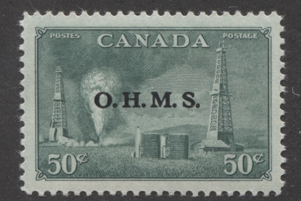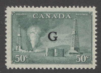 The only value of this series to exist with the O.H.M.S overprint is the 50c oil wells as shown above. The reason is that this value was issued in March 1950, while the G overprint had replaced the O.H.M.S overprint by the time the other values were issued, starting with the 10c furs in October 1950. It would appear also that the "no period after S" error that had occurred on the earlier War and Peace designs had now been corrected, as this stamp is not known with that variety.
