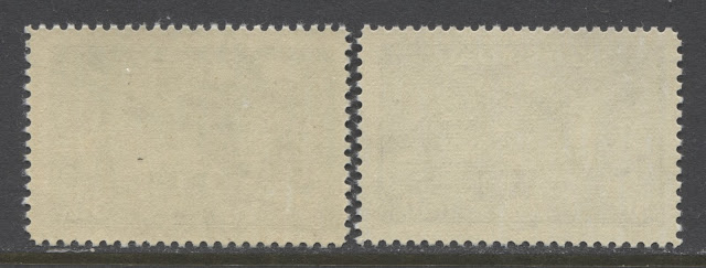 In terms of gum, there are two types. The earlier paper without the ribbing tended to have a smooth cream gum that had either a satin sheen, as shown on the left hand stamp above, or it had a semi-gloss sheen as shown on the right stamp. The later paper had a more yellowish and much more shiny gum, as shown on the middle stamp.