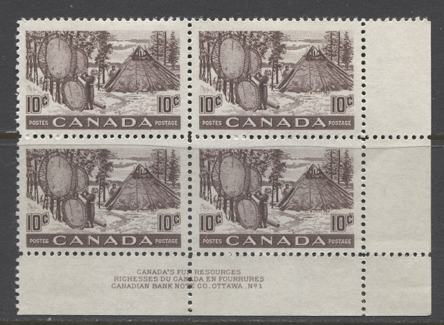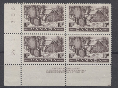 The designers of these issues were varied and we are introduced to a new name in stamp design, that featured prominently in the 1950's and 1960's: Allan Pollock, who went on to design the 25c chemical industry stamp of 1956 and the Export $1 of 1963. Herman Herbert Schwartz, whom many of you are already familiar with designed the 50c oil wells stamp, and was involved in the design of the 10c fur resources stamp, along with the National Film Board. Fairbairn Art Studios cooperated with the Federal Department of Fisheries in designing the new $1 definitive stamp, featuring the fishing industry. These issues mark the first time that non-career designers were heavily involved in the design of Canadian Postage stamps.