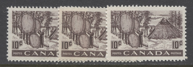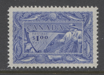 Today's post will be much shorter than in the past several weeks and will look at the high value definitive stamps that began to replace the designs of the 1946 Peace Issue, starting with the 50c in 1950. They are interesting stamps because they technically occupy both the end of King George VI's reign, as well as the very beginning of Queen Elizabeth II's reign. So they really ought to be included in your collection if you are a specialist of either reign. Although they do not display quite the same range of paper, shade and gum varieties as the earlier Peace Issue, there are still some worthwhile varieties that can be collected. I will illustrate most of them here, though there is one very dull, cold shade of ultramarine on the $1 fisheries that I do not currently have an example of.