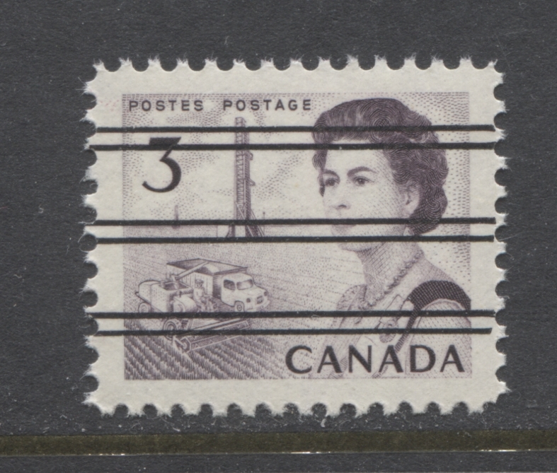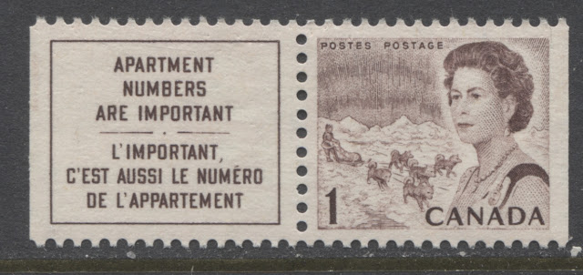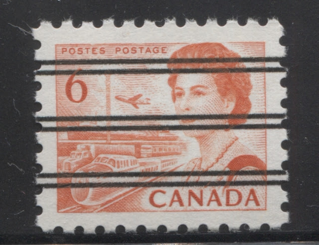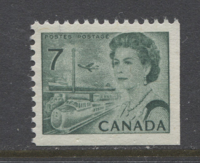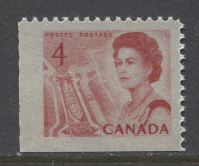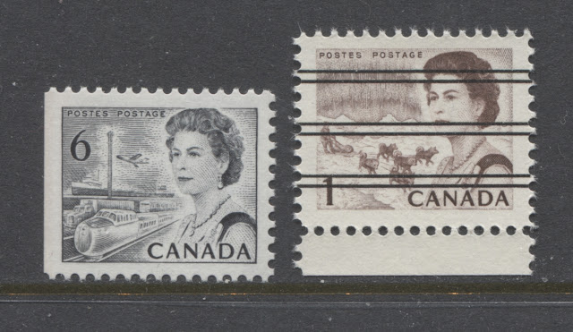 Both of these stamps are printed on horizontal wove paper. The one on the left is a 10c Jack Pine on dull fluorescent paper, while the one on the right is a 50c Summers Stores on hibrite paper. Both of these stamps have a visible vertical mesh. The mesh on the 50c is much more obvious and can be seen clearly in the scan if you look carefully. The mesh on the 10c is much lighter, and can really only be seen in person - on the scan, the paper just looks smooth.