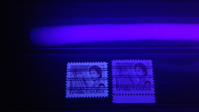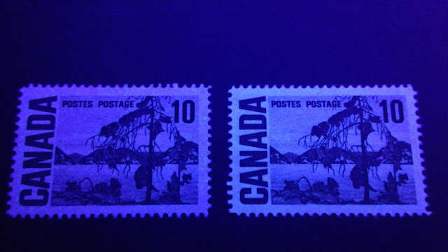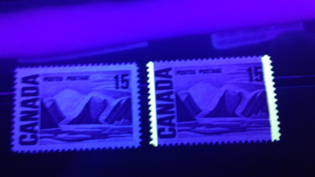 Today's post will tackle the aspect of this issue that has probably received the most attention from specialists of this issue, and is definitely the most fun, but also the most confusing: the paper fluorescence. The study of paper fluorescence has been a "thing" since Irwin, Keane and Hughes, and Gronbeck-Jones published articles about this topic in the 1960's when the issue was current. However, it was, until relatively recently a fringe topic that was well outside the scope of even the Canada Specialized catalogue. I can well remember when I was a child in the early 1980's that the only paper varieties listed for this issue were plain paper and hibrite paper. However, since the late 1980's the topic of paper fluorescence has received more and more attention from mainstream philatelists, and consequently, the number of listings in the Unitrade specialized catalogue has grown considerably.