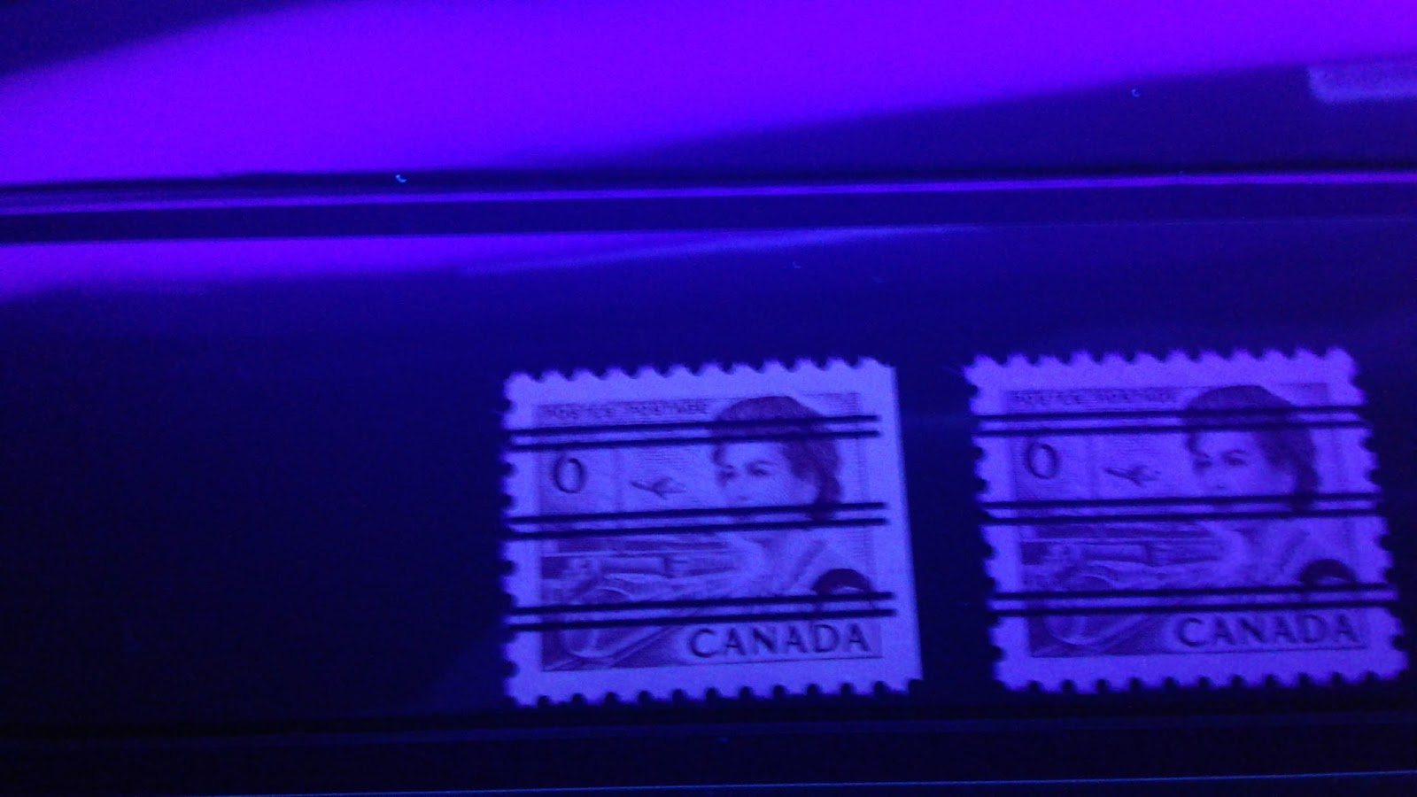 The stamp on the left is on dull fluorescent paper, and is a pure white, while the stamp on the right is a deep violet - almost the same colour as the light itself. The stamp on the right is on dead paper. Interestingly, there is no listing currently in Unitrade for a 4c precancelled stamp on dead paper, which goes to show that while the Unitrade listings are extensive, they are by no means complete.