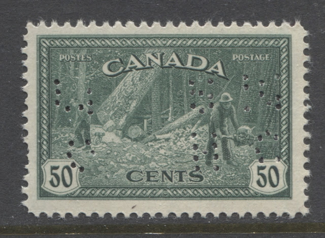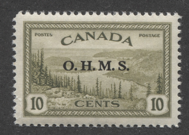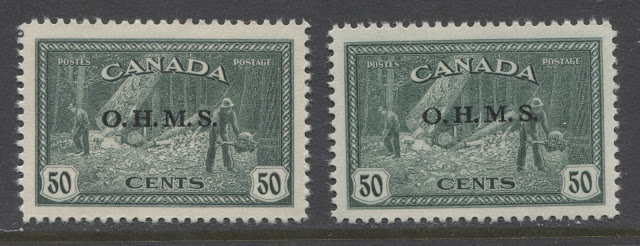 The above scan shows the black OHMS overprint that was introduced on these stamps late in 1949 to replace the perfins. It was used on the 10c, 10c special delivery, 14c, 20c, 50c, $1 and the 7c airmail stamp. The genuine overprint has the following characteristics:
