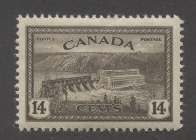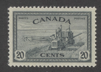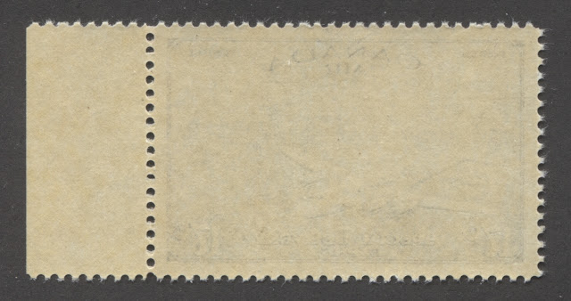 Initially when the stamp was released on September 16, 1946, the accent that was above the second "E" of "Express" was a circumflex, as shown in the first scan above. It was quickly brought to the attention of the authorities that this was not the correct accent to use on this word, and that a grave accent should have been used instead. The die was corrected to show a grave accent, and the stamp was re-issued on December 3, 1946 with the correct accent, as shown in the second scan. Because this was a correction of an error, there were very few first day covers produced, so that first day covers are very scarce and valuable. Also, the number of stamps issued in the corrected die is exactly three times as many in the incorrect die. Surprisingly, the Unitrade values of both stamps are very similar, for both used and mint. In reality, most stamps you will come across, will be mint. Finding nice used examples cancelled in-period, before 1949 can be quite challenging. Finally, the two scans above also show quite nicely the difference in shades between the bright ultramarine of the first printings, and the deep dull ultramarine of the later printing.