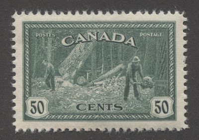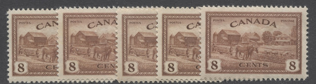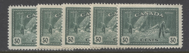 20c Greenish SlateThe 20c is a greenish black, that varies according to whether there is more black or more slate in the colour. I have seen a pure greenish black, which seems to be from the later printings, as this value was not replaced until the 20c Newsprint Industry stamp was released in April 1952. The above scan shows some of the typical variations found, with the stamp at the extreme left having clearly more black than the one on the extreme right, which has more slate, and is more greenish. Unitrade calls this colour slate-black. But I do not think that is an accurate name, as it ignores the fact that all shades of this colour contain some green.