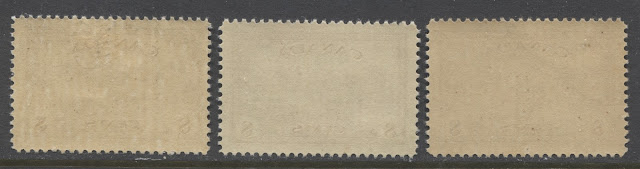 - Smooth cream gum with a satin sheen, on thinner, crisp, vertical wove paper, showing no mesh, and no ribbing on either the front or the back. This is shown on the middle stamp of the first scan above.