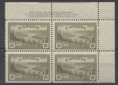On most issues printed by the Canadian Bank Note Company, the lower left and lower right blocks can be found with one or more coloured dots in the selvage. It is not known why these dots were placed in the selvage, but different configurations have been found. A study would be needed to determine whether or not more than one dot configuration exists for both lower left and lower right positions. If you look at the scan of the lower left block above, you can see two dots in the lower selvage tab, on either side of the inscription, and no dots on the left selvage tab. On the lower right block shown above though, there are three dots visible: two on the lower selvage tab, and one on the right tab at the top.