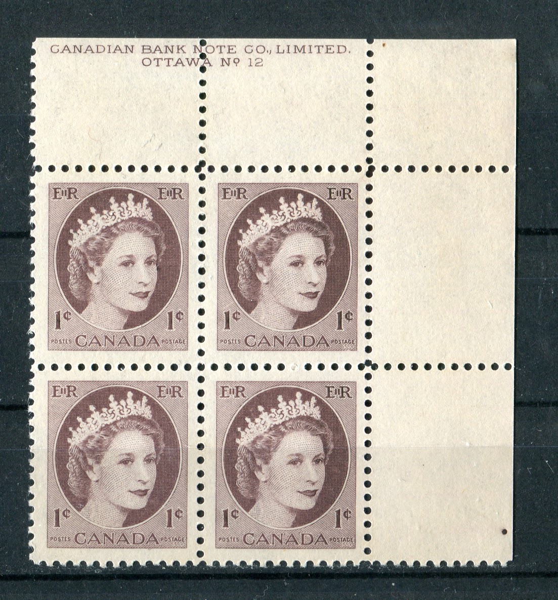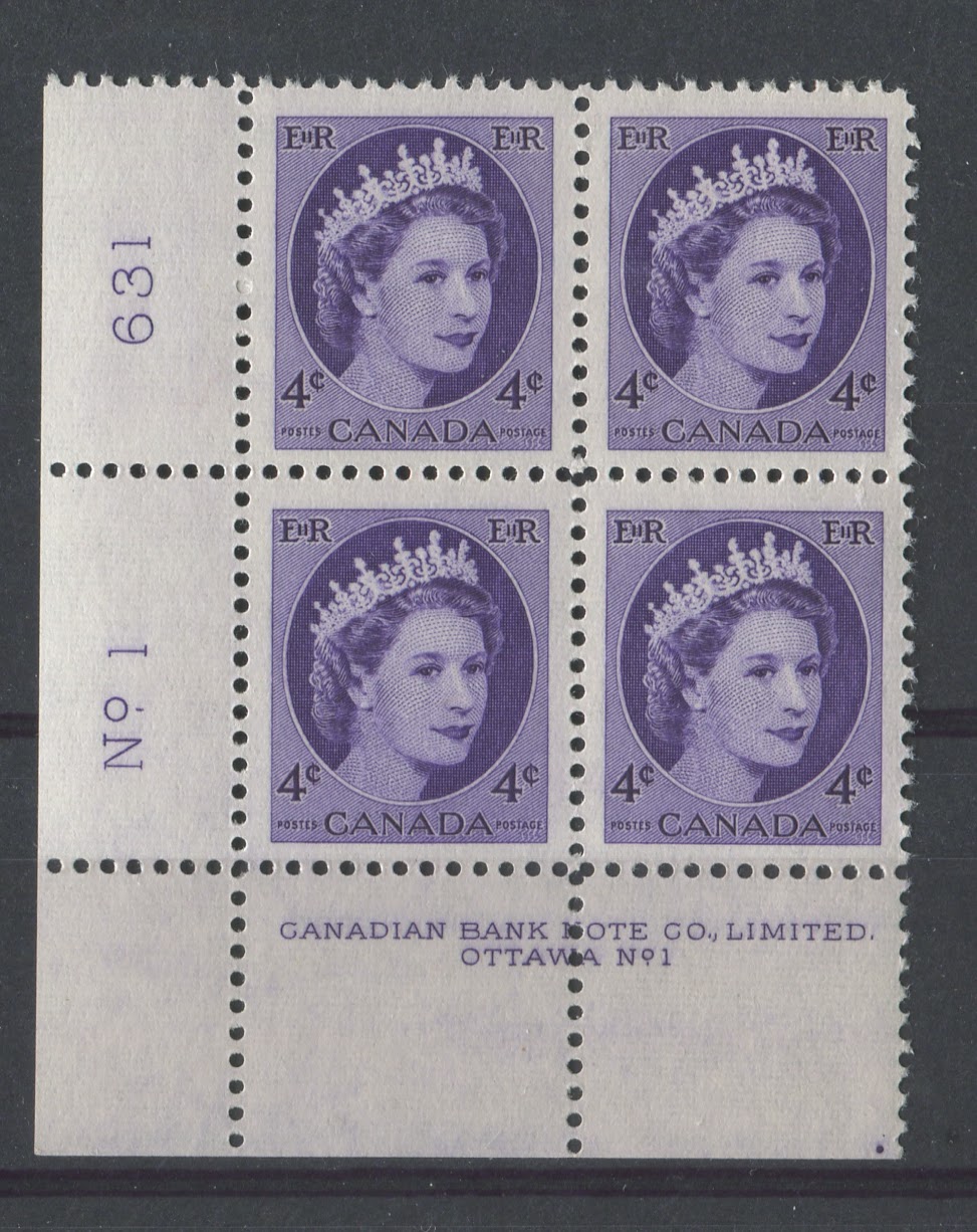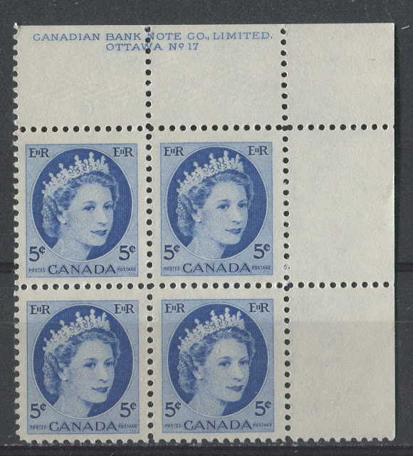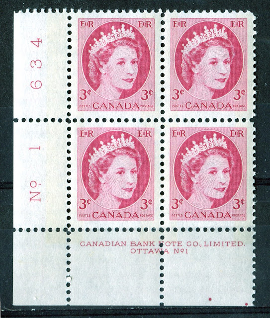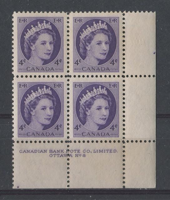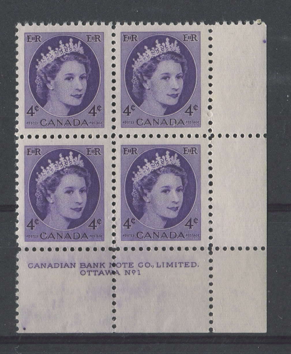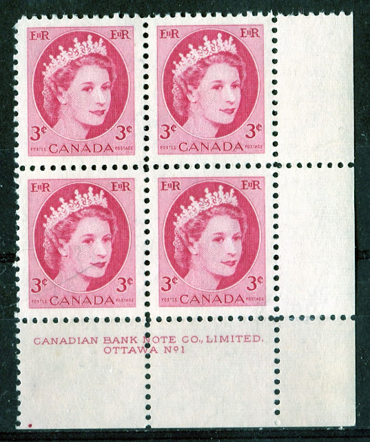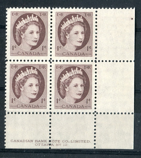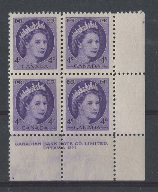 This is a topic that only became apparent as I worked on many hundreds of plate blocks, but has turned out to be one of the mysteries of plate blocks printed in the modern period. Several years ago, I noticed that many lower right blocks and many lower left blocks contained a coloured dot in the lower selvage. I do not know what the significance of these dots are, but it seemed as though every issue from 1935 onward printed by the Canadian Bank Note Company has these dots only on the two lower positions.