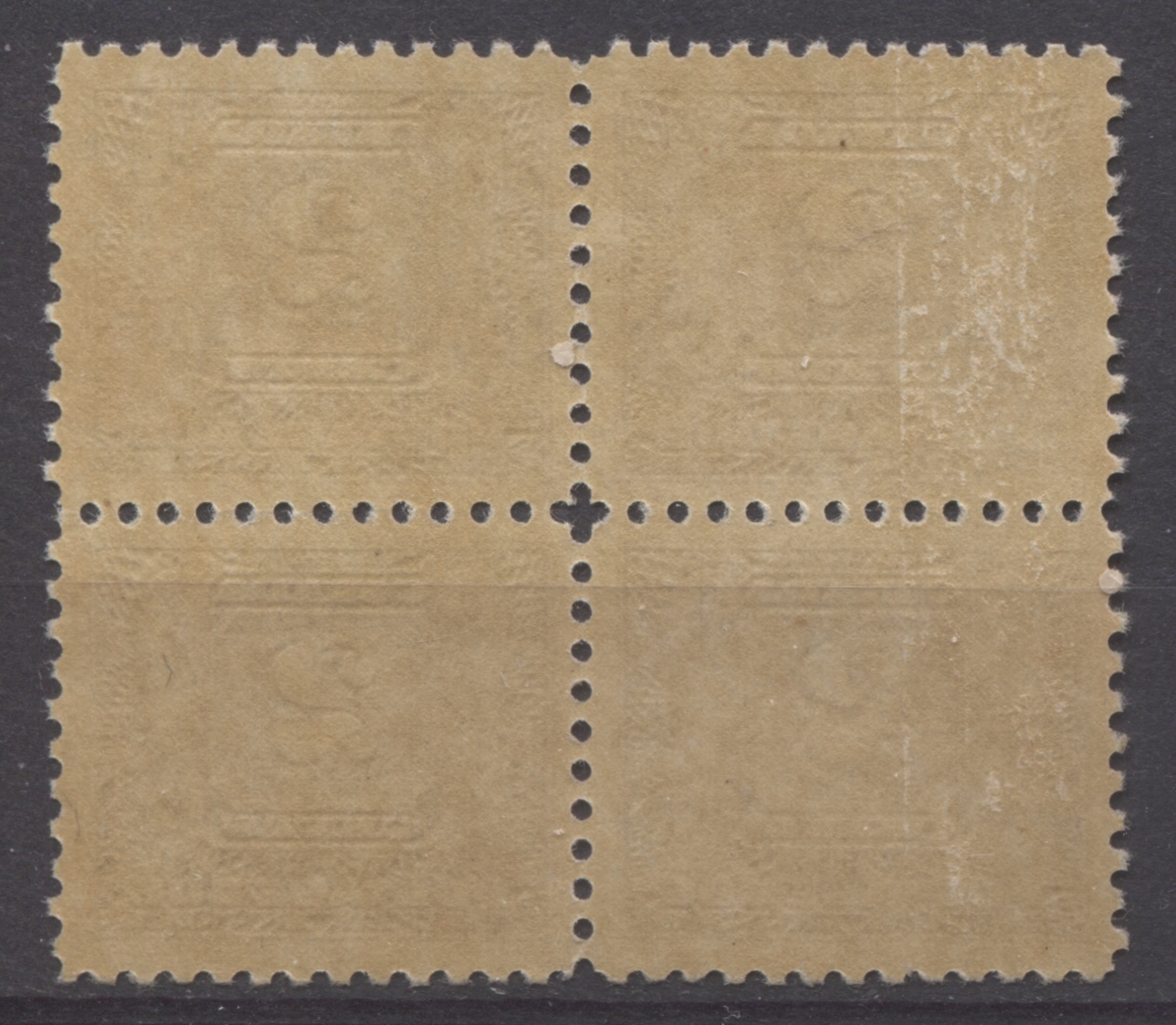 Unlike other issues where the plate blocks are collected as corner blocks, this issue is very different. The sheets contained no inscriptions whatsoever, except for a reversed "1" in the top margin between columns 5 and 6. On the 5c, this number is found on both the top and bottom margins. Only one plate was used for every value, so this means that there was only one possible block of 4 per sheet of 100. On the 5c, every one of the four panes of 100 would have a block, but on the other values, these blocks occur only on the top two panes. This makes them very scarce, as the maximum number that could have existed at the time of printing was thus: