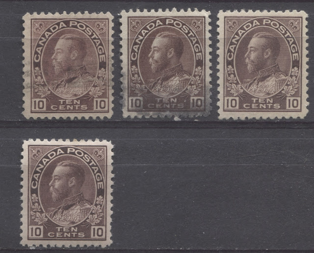 This post will deal with the last of the intermediate value Admiral stamps before I deal with the three high values, the 20c, the 50c and the $1. The Unitrade catalogue until fairly recently did not list any shades at all of the 10c bistre brown, and has only ever listed two shades of the first 10c: plum and reddish purple. As we shall see though, there is a fair range of shades of the first 10c, and also there are more than two shades of the bistre brown as well. In keeping with the structure of all previous posts, I will illustrate examples of each Unitrade listed shade and will then cross-reference the shade names with the Stanley Gibbons Colour Key.