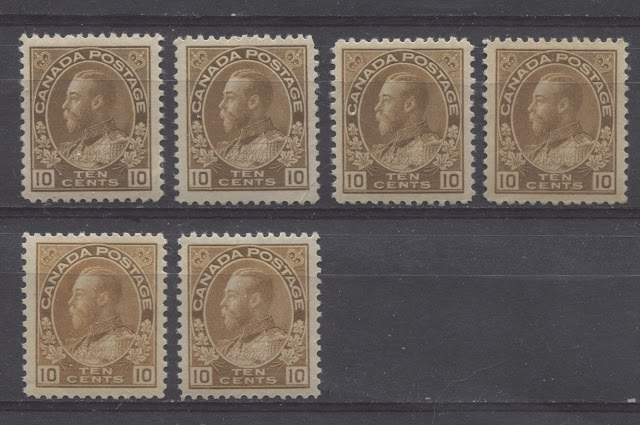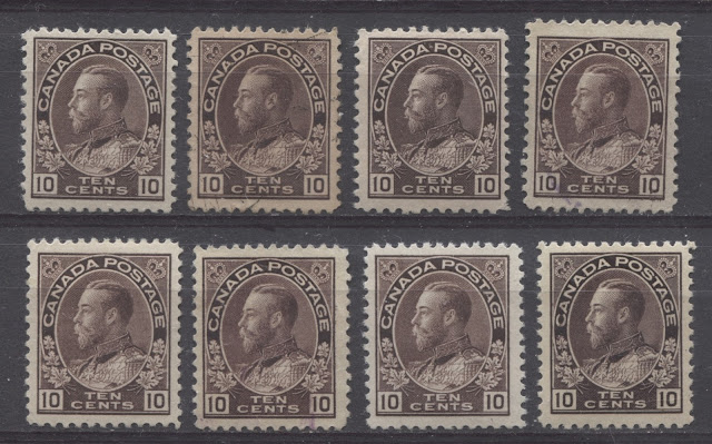 The stamps on the top row are all examples of the bistre-brown, while the stamps on the bottom are the listed yellow-brown shade. As you can see, the yellow brown is quite distinct. From left to right, on both rows we have: