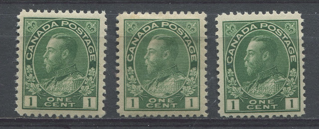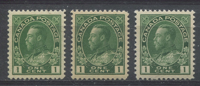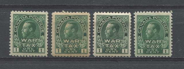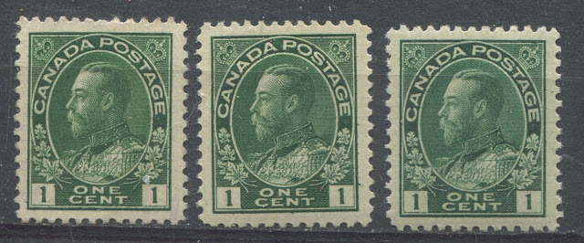 Unitrade indicates that this shade group is the original 1911 release, but I think that in reality, this shade group is meant to catch all the dark greens that are neither bluish, yellowish or greyish. So in a sense, it is a bit of a catch all group. One factor that I have considered in my allocation of stamps to this group is to consider the shades found on the War Tax stamp, and I would note that they generally match the shades in this group, and Unitrade describes the War Tax stamps as being simply "green".
