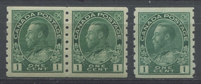 The 1c admiral stamp was issued in both sheet form and in three different coil perforations, as well as in booklet panes. In addition to the regular issue, a War Tax stamp was also issued in 1915, which incorporated the words "War Tax" right into the design. Unitrade lists six different shades of the sheet stamps, three of the perf. 8 vertical coil, and two of the perf. 12 horizontal coil. There are no shades listed on the War Tax Issue.