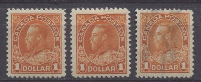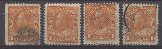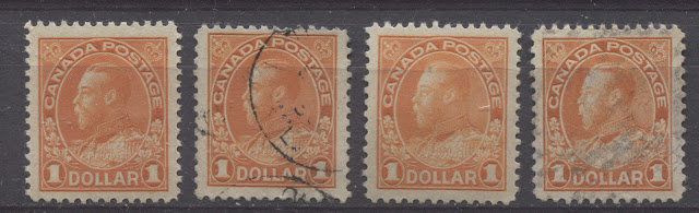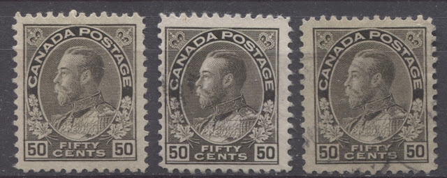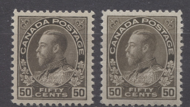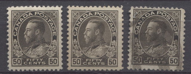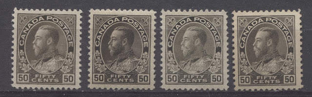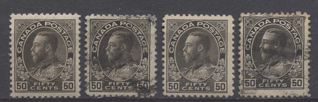 This is the last of my detailed posts dealing with the shades of the very popular Admiral Issue of 1911-1928. The 50c value has four major listed shades in Unitrade, which are not too difficult to distinguish, while the $1 has three. However, one of the difficulties that collectors will encounter when trying to sort their stamps is the fact that there are several sub-shades within many of the major shade groups that may lead to mis-identification for those who are not familiar with the characteristics of the major shade groups.