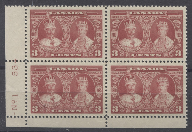 The plate blocks for this issue are all scarce, as indicated by the fact that the Unitrade value is significantly higher than the corresponding price of 6 single stamps. In fact the scarcest positions are 6-10 times the price of single stamps. So without any consideration of shade, paper or gum variations, there are at least 52 different plate blocks. Collecting them all will require several thousand dollars. So they are by no means inexpensive, or as easy to find as you might think.