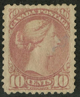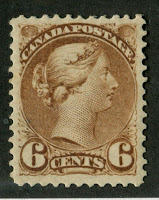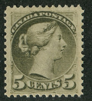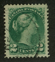 The chief interest in this issue, and the point that has caused many collectors much frustration is the classification of the staggering number of printings made of these stamps. The printing was first done in Ottawa until fire destroyed the printing plant in 1872. These printings are called the "First Ottawas". In 1872 the printing was moved to Montreal where it remained until 1888. There was a brief period in 1887-1888 where some of the stamps were printed at the Montreal Gazette. These stamps are all referred to by collectors as the "Montreal Printings". Finally in 1888, the printing was moved back to Ottawa, where it remains until the end of the issue in 1897-1898. These last printings are often referred to as just "Ottawa Printings", but they are really the "Second Ottawas". The stamp catalogues price the Montreals and first Ottawas at much, much more than the more common second Ottawas, and give full catalogue numbers to the second Ottawa printings of all stamps except the half cent, 1c and 2c as shown in these scans:
