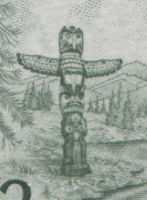 Today's post will delve into a specific set of plate flaws that are specific to one value from the series: the 2c Pacific Coast totem pole. Two weeks ago I touched on the existence of several different plate flaws involving the eyes on the totem pole. In total, there are some 33 different varieties, that are located in different positions, on the various panes that comprise a full post office sheet of 600 stamps. Today, I will attempt to illustrate as many of these as I currently have in stock. Then, as I acquire more of the 33 known varieties, I will update this post to add examples.