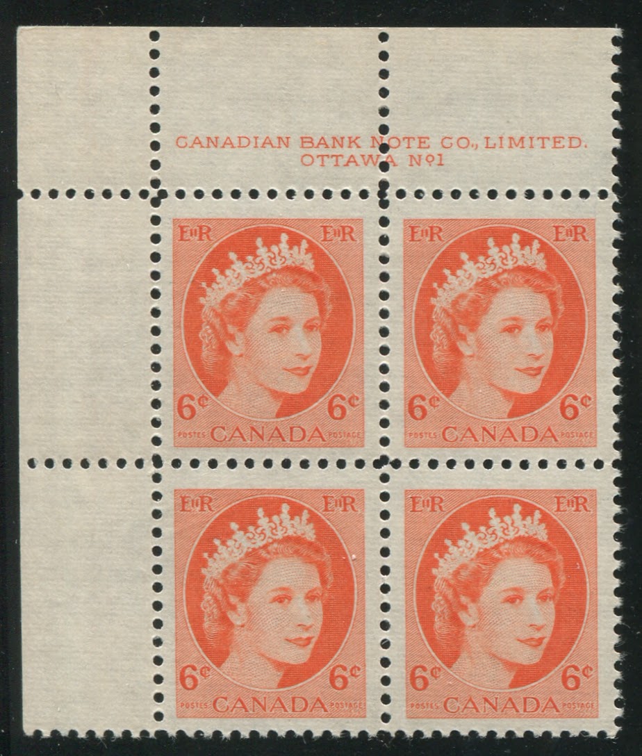 The plate inscriptions used on this issue are the same style and appearance as the last issue. A very large number of plates were employed to print the stamps of this issue, with up to 20 different plates being used for most of the low values. There was a period between November 1957 and May 1958 where thee post office trimmed all sheets in response to complaints by postal clerks who were tired of breaking up sheets to supply corner blocks to collectors. However, due to an outcry by the public, the post office re-introduced corner inscriptions in May 1958.