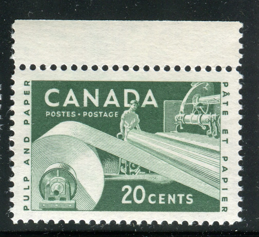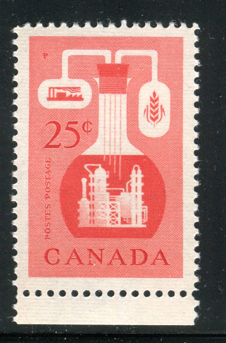 Eventually, plans were made to replace the 10c Furs Industry, which had been in use since 1950, the 15c Beaver design which had initially been part of the 1951 CAPEX issue and the 20c Pulp and Paper Industry stamp of 1952 with new designs. The new 15c was issued on April 1, 1954, the 10c on February 21, 1955 and the 20c on June 7, 1956. In addition on that same day there was a new denomination introduced, a 25c scarlet vermilion, depicting the Chemical Industry. This stamp was needed for local registered letters and to pay the 25c foreign, non-preferential airmail rate.