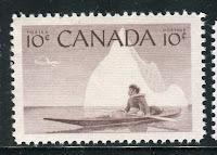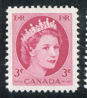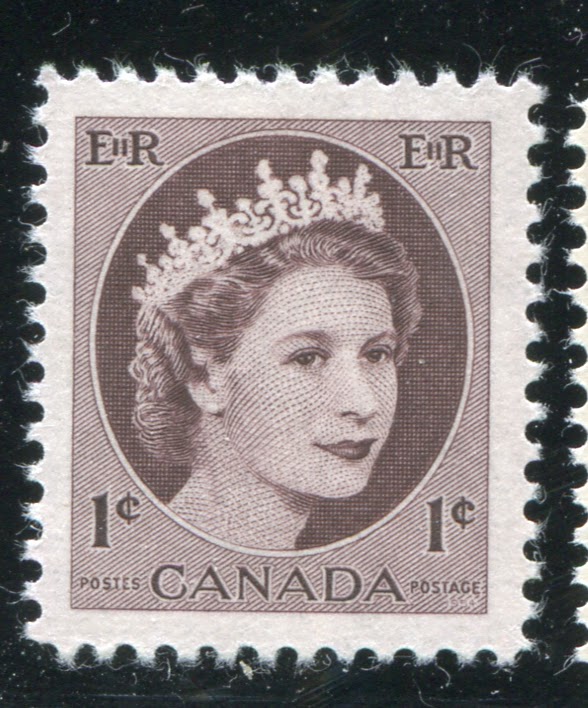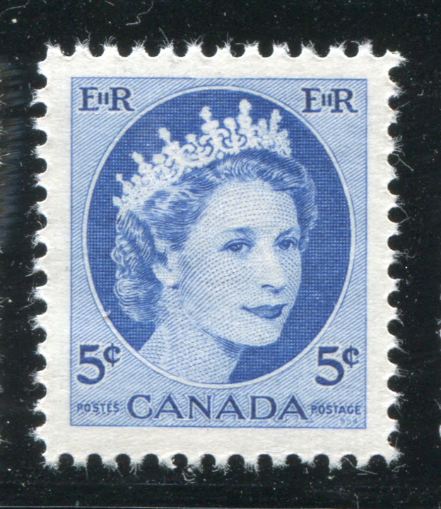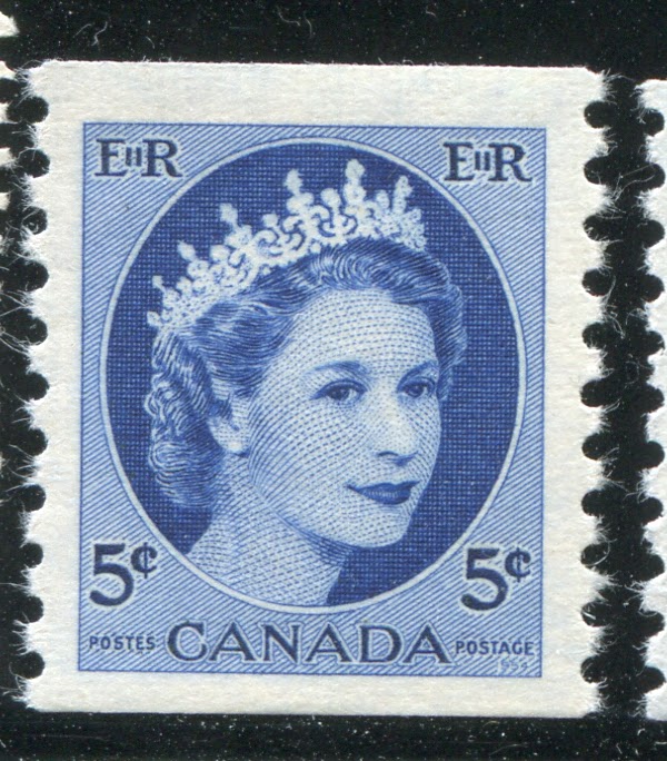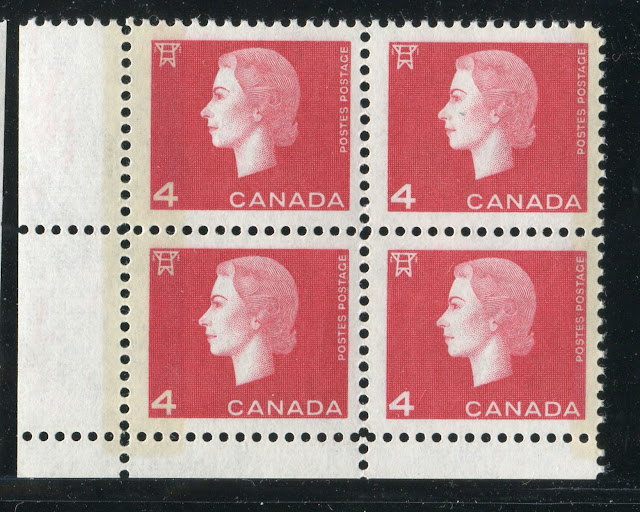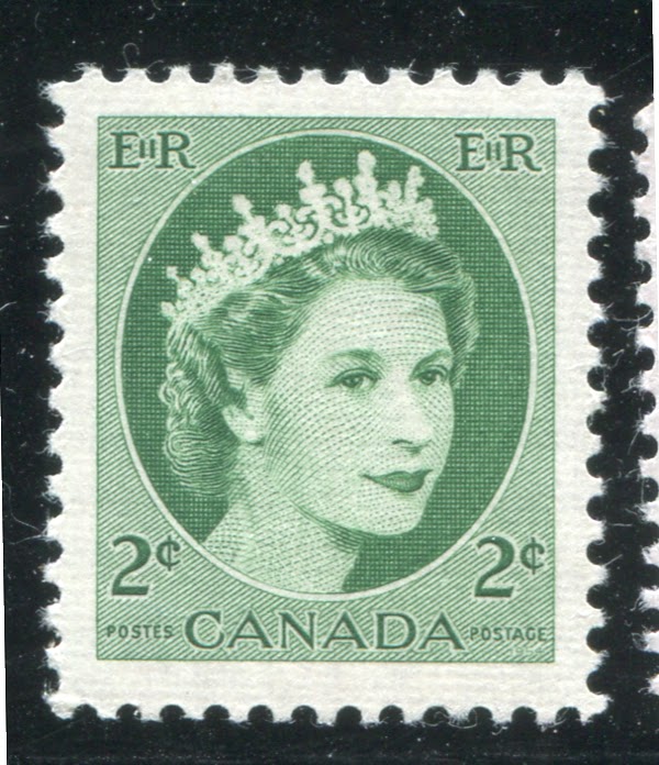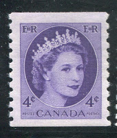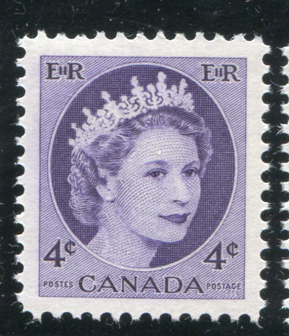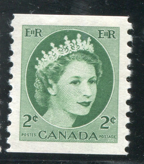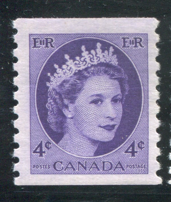 Like the previous issue, coil stamps were issued for the three most commonly used values. Due to an increase in the domestic rate from 4c to 5c in 1954, the values so issued were the 2c, 4c and 5c. Like previous coil issues, there exist numerous spacing varieties, which I will detail in another post, as well as repair-paste-ups and start and end strips. However, the coils also exist with a"damaged E" variety in which the left "E" in "EiiR" appears distorted. Finally the 2c and 4c values are listed by Unitrade with fluorescent (2c) and hibrite (4c) papers. However, I think that probably all three values exist with fluorescent papers of some kind.
