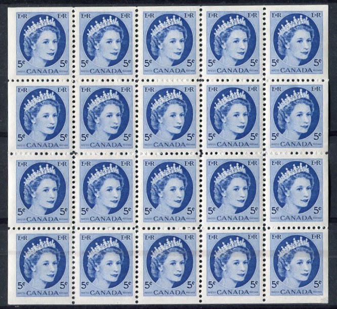 Unlike the previous issue, there were no English booklets, nor were there any chewing gum booklets issued. However, the dotted cover design was continued on two 25c booklets, being replaced in 1956 by the lined design on the right. As we shall see in the detailed post on the booklets of this issue, there are still a considerable number of collectible varieties possible on the booklets of this issue, as the lined design exists in different widths, and the paper varieties add additional complexity.
