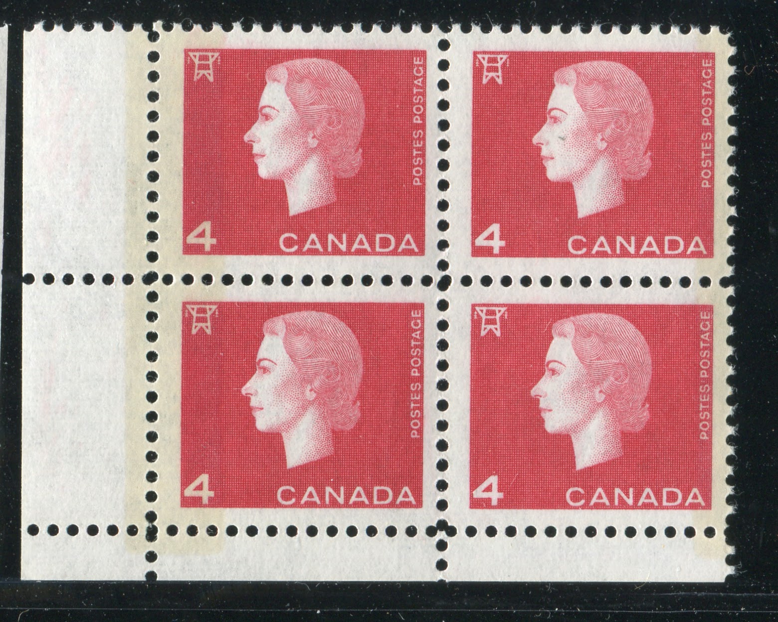 I have used a block of the 4c Cameo Issue to illustrate the tagging because it is usually rather hard to see on the Wilding stamps and would not show up well in a scan.