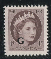All the low values except for the 3c and 6c were issued with G overprints in the 14 point Casson font. So far they are not known with the 14 point bold "flying G" font. As you can see from the illustrations below, the G is normally found just to thee left of the chin. Paper varieties of all values exist, as do narrow spacing varieties, which are often collected in strips of three.