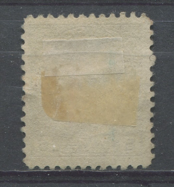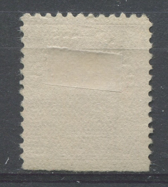 This is the back view of the wet printing 5c shown above. As you can see, the gum is smooth in appearance, with no engraving lines from the design being visible. All wet printings have smooth gum like this that is either shiny or satin-like in terms of sheen.