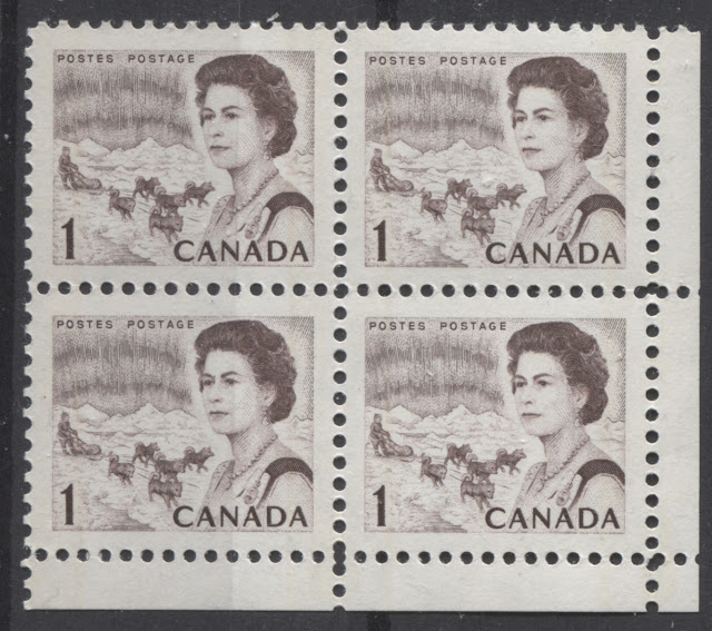 Today's post will be the first of two posts that will explore the tagging that is found on many stamps of this issue. Collectors with even a passing familiarity with this issue will know that there were two basic types of tagging used on this issue: Winnipeg tagging and Ottawa tagging. Today's post will look at the first of these in depth: Winnipeg tagging. The Winnipeg tagging was first introduced in 1962, and so was in use on all printings of the low values from 1967 until 1972 when Ottawa tagging began to replace it. Interestingly, the tagging was not introduced on the high values until December 9, 1969.