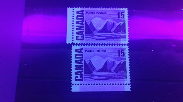 The first two 15c stamps on the top row have PVA gum, one being eggshell, and the other a matte PVA. The third 15c on the top row has dex gum. In all three cases, the tagging bars are clearly visible and are a pale yellow colour. The tagging on the 10c stamp is very similar in appearance to the tagging on the 1c hibrite stamp that was just shown, and can only just be seen as a very, very slight darkening of the sides of the stamp. The tagging on the 25c hibrite stamp is similar again, but shows more pronounced darkening. In reality, it is probably the same pale yellow that the 15c stamps are. It's just that the appearance has been so completely altered by the brightness of the paper that the stamp is printed on. The afterglow for the high values was about a second longer than on the low values: 3-4 seconds for the stamps on non-hibrite paper, and 1 second or so for the hibrite paper stamps.